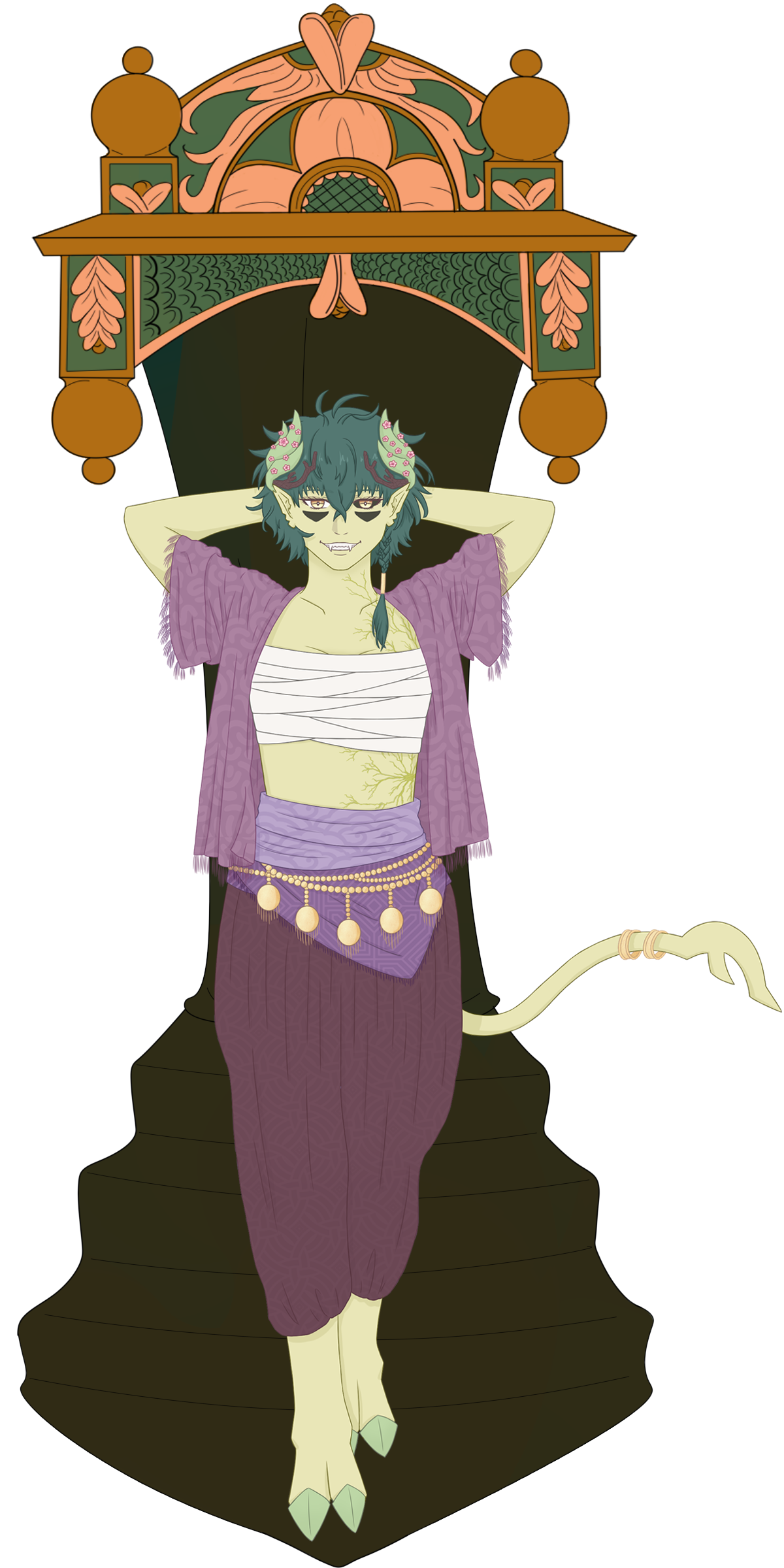 A witch in their early thirties who came from Ekreles to Darbek because of a prophecy. Aiden diligently lives by the tenets of The Blind One. They share their love for magic and thirst for knowledge with Pumpkin, something that they quickly bonded over after serendipity brought them together in Darbek. Aiden often jokes that meeting Pumpkin must have been the fateful event that led them to the city. As a sign of their close bond, Aiden and Pumpkin have exchanged their true names with each other.